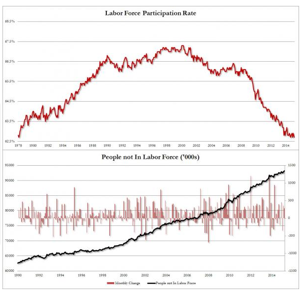 Comme vous pourrez le voir sur ces graphiques, jamais depuis 1978, la population active n’a été aussi faible aux États-Unis. La raison est simple. Les gens par millions, ici nous parlons tout de même de 93 millions d’Américains, savent qu’ils sont tout simplement exclus et définitivement du monde du travail. Pour faire baisser le nombre de chômeurs, il suffit de faire disparaître de la population active tous ceux qui cherchent du travail…